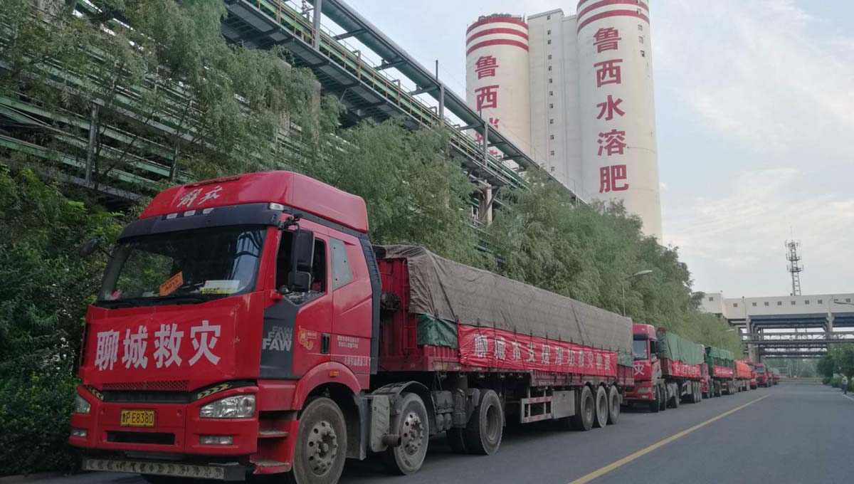 9月1日,魯西集團接到聊城市委市政府采購救災物資需求后,集團黨委迅速部署,化肥事業部全員上下高度重視,緊急協調相關部門,做好計劃下達,安排物資生產發運。當天下午,8輛滿載共計350噸高塔硝硫基復合肥的大貨車整齊地排成一列,車身懸掛著“聊城市支援濰坊救災物資”條幅,運往濰坊支援災區群眾迅速恢復生產。